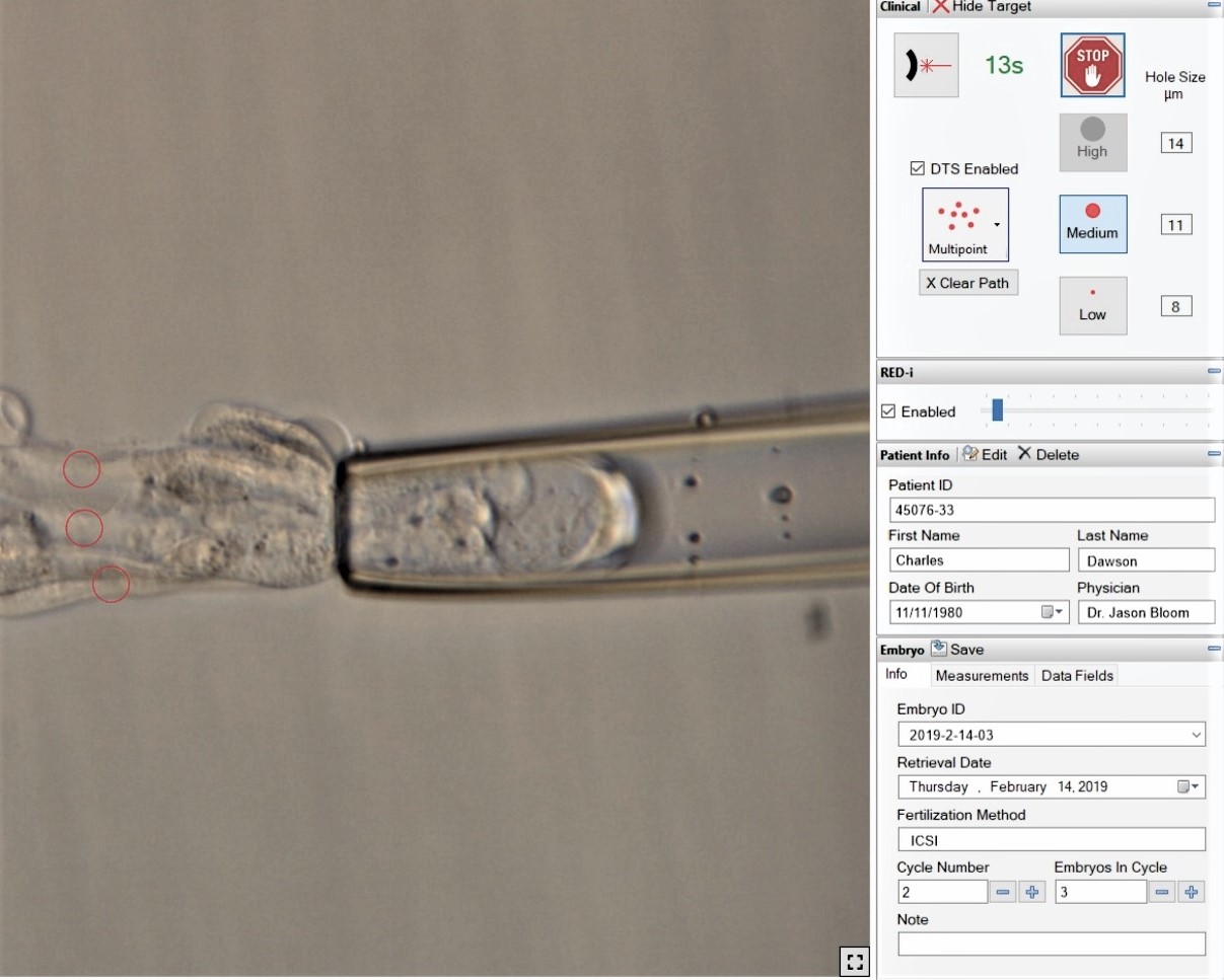 LYKOS with DTS provides computer-controlled accuracy and advanced targeting features during assisted embryo hatching or biopsy.